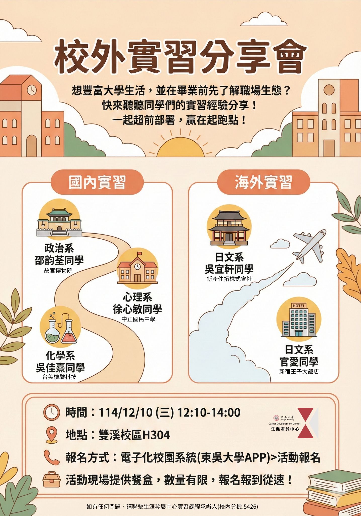 如有任何問題,歡迎聯繫生涯發展中心實習課程承辦人(校內分機:5426)