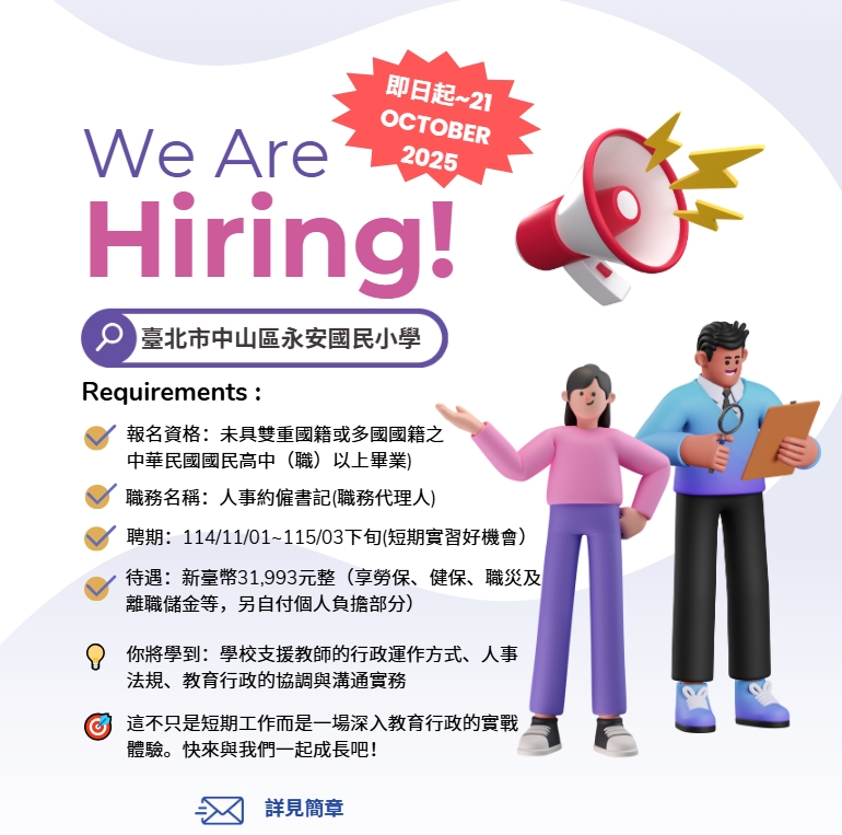 臺北市中山區永安國民小學 114 年度人事室約僱書記甄選